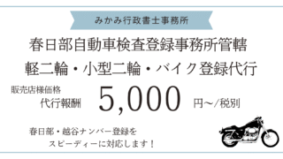 軽二輪・小型二輪 バイク 埼玉県南埼玉郡宮代町/軽二輪・小型二輪バイクの名義変更・登録代行 軽二輪・小型二輪バイク 移転登録 新規登録 名義変更 登録代行報酬5,000円~(税抜)春日部自動車検査登録事務所への手続きをスピーディーに対応いたします。 2024.07.03 2025.10.15 軽二輪・小型二輪 バイク